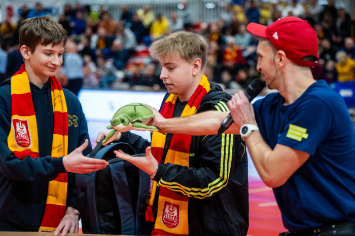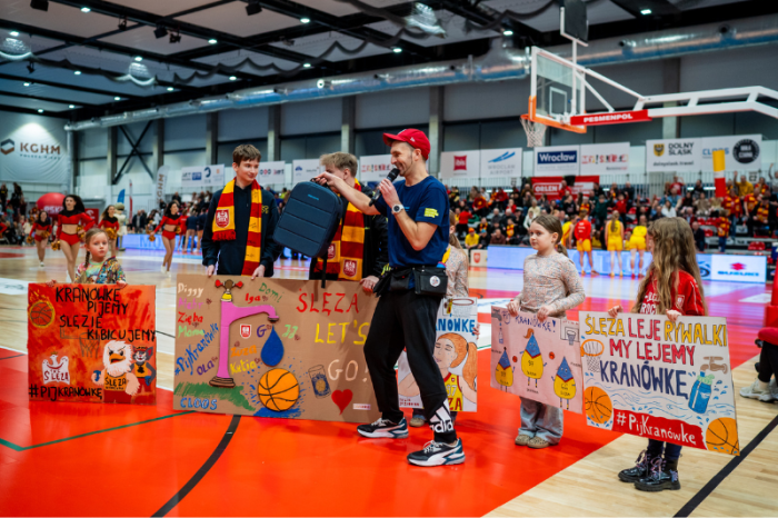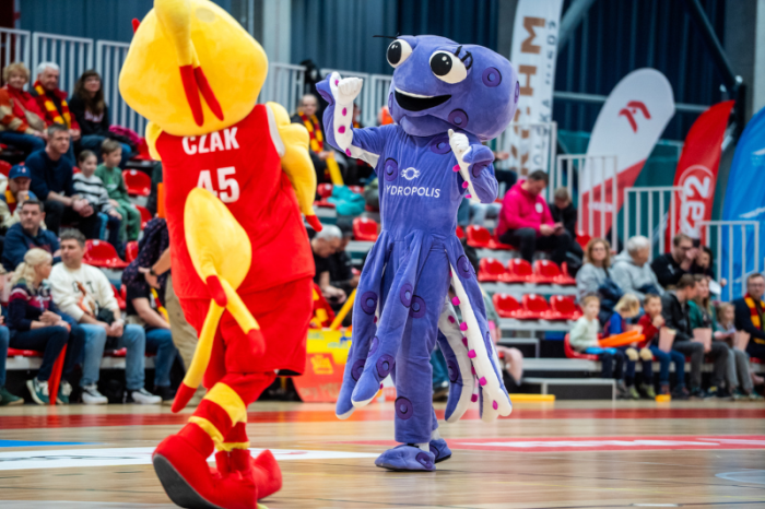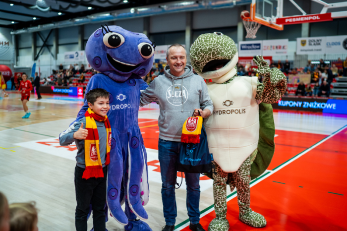 Dodatkowo świetną robotę przed spotkaniem oraz w przerwie wykonał Wujek Lisek, nasz ulubiony animator. Bawił się każdy, niezależnie od wieku. W holu znajdował się bar wodny, gdzie można było poczęstować się naszą kranówką w różnych smakach. A wszystko po to, by zachęcać do picia dobrej, zdrowej, wrocławskiej wody z kranu – wspólnie z naszymi maskotkami – Ośmiornicą i Żółwiem, a także maskotką klubu Ślęzy – kurczakiem Czakiem.